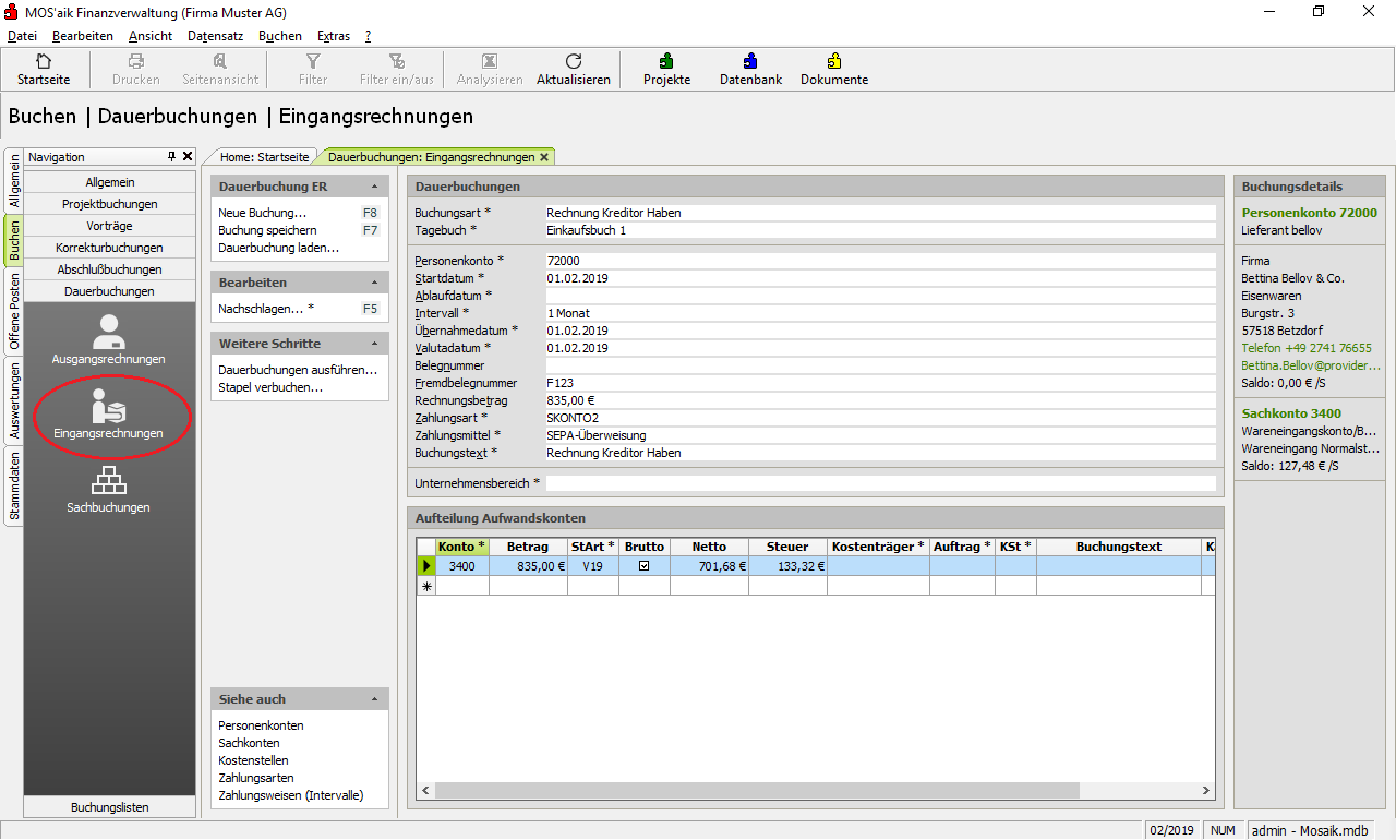 Eingangsrechnungen Erfassung periodisch wiederkehrender Eingangsrechnungen mit einem festen Betrag. |