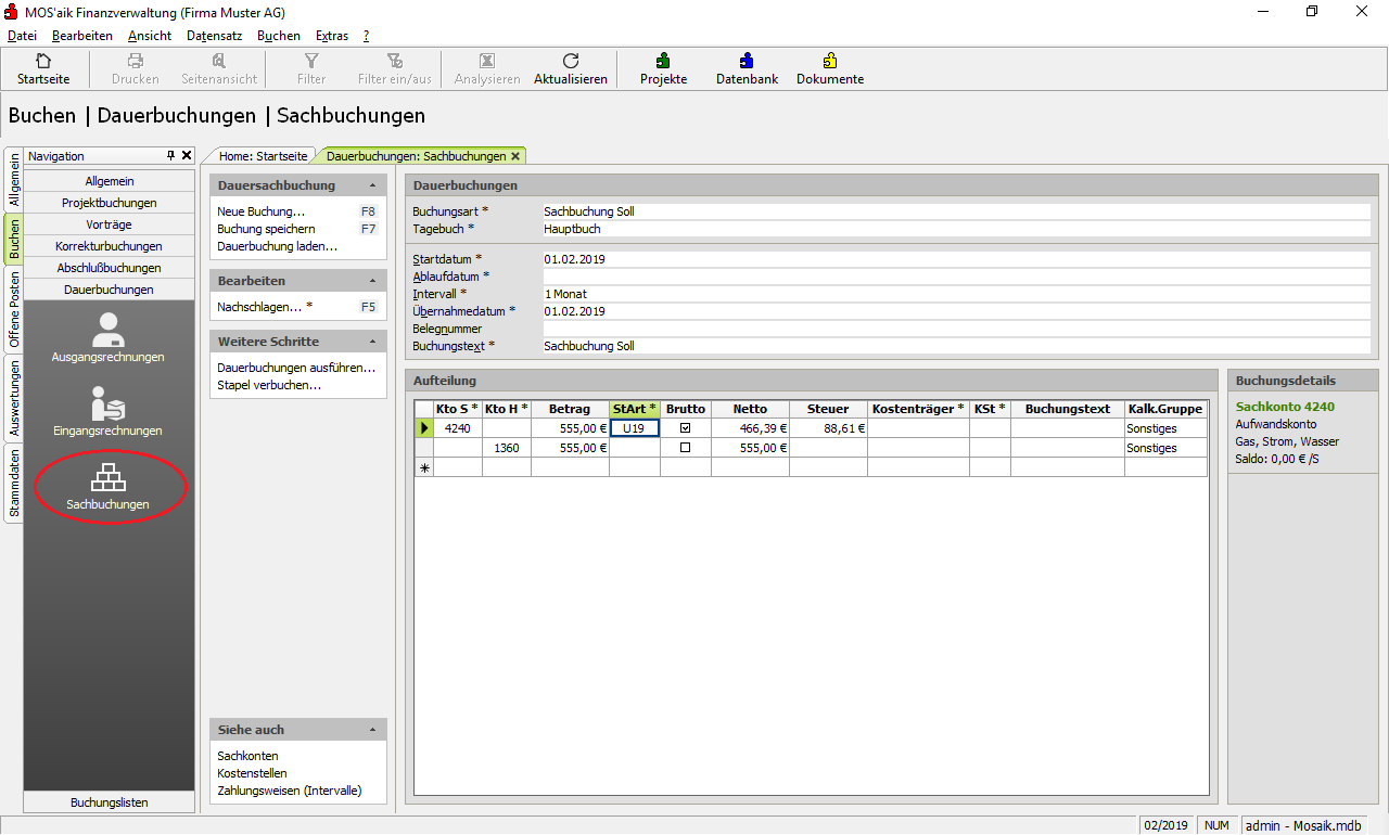 Sachbuchungen Erfassung periodisch wiederkehrender Sachbuchungen mit einem festen Betrag. |