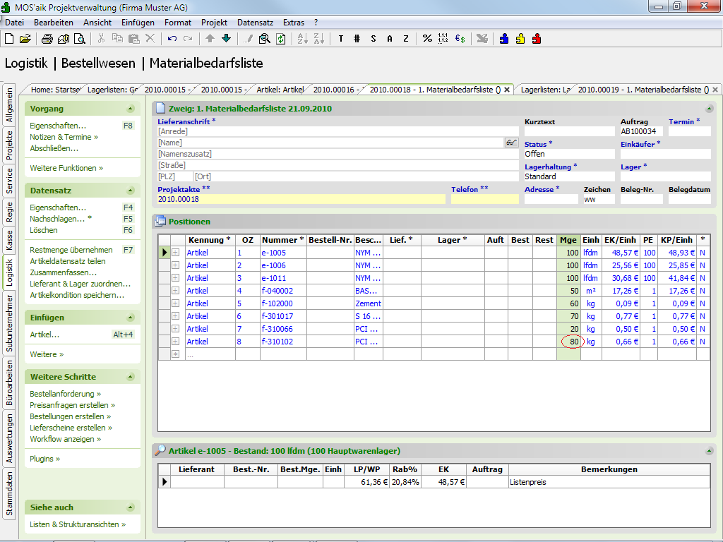 Beim Erzeugen einer Materialbedarfsliste anhand der Gesamtlagerbestandsliste oder aus der Bestandliste eines konkreten Lagers, wird die bereits pro Artikel bestellte Menge berücksichtigt d. h. vom Bestellvorschlag abgezogen: