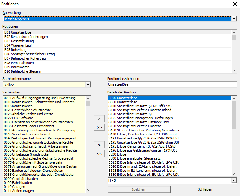 Um die Positionszuordnung von Sachkonten für dokumentbasierte Auswertungen individuell anzupassen, können diese über das Feld Auswertung im Menüdialog → ausgewählt und die Sachkontenzuordnungen direkt geändert werden. Die Auswertung , über die der Dialog aufgerufen wird, ist dabei standardmäßig voreingestellt: