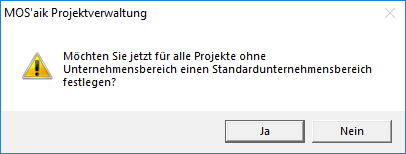 Bestätigen Sie den Dialog und wählen Sie im nachfolgenden Auswahlfenster den gewünschten Standardunternehmensbereich aus. Damit werden alle Projekte ohne zugewiesene Unternehmensbereiche entsprechend zugeordnet.Führen Sie vor dieser Umstellung eine Datensicherung durch, um ggf. den vorherigen Stand wiederherstellen zu können!