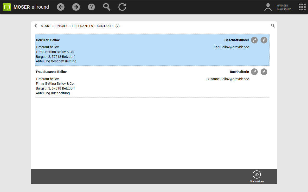 Kontakte können hier über bearbeitet sowie über den MOSER 'allround' Kommunikator mit kontaktiert werden. Um neue Kontakte anzulegen oder vorhandene zu löschen, bearbeiten Sie die Adresse mit und wählen Sie das Feld Kontakte.