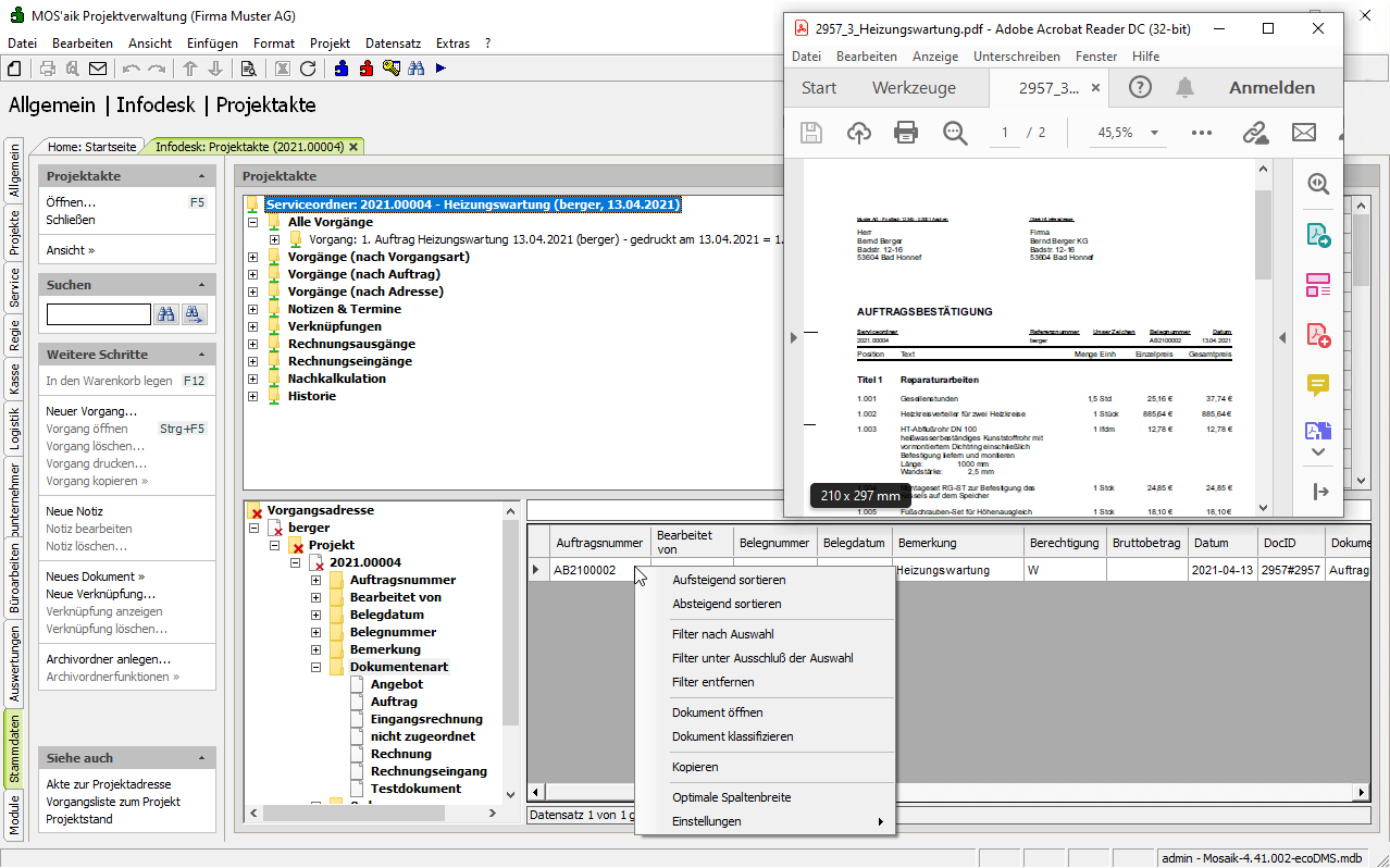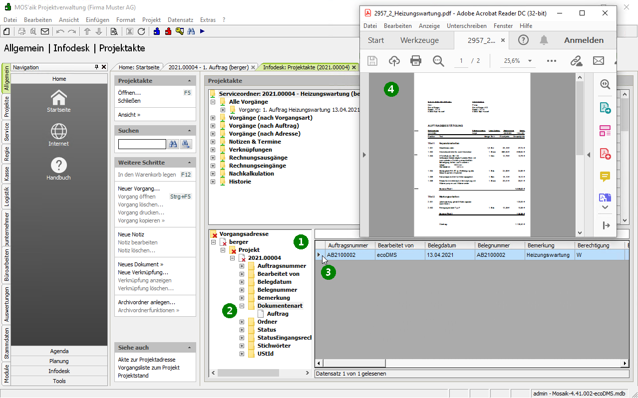 In diesem Abschnitt öffnen Sie die Projekt-, Kunden- oder Lieferantenakte zu einem bestehenden Vorgang und öffnen darin archivierte Dokumente:
