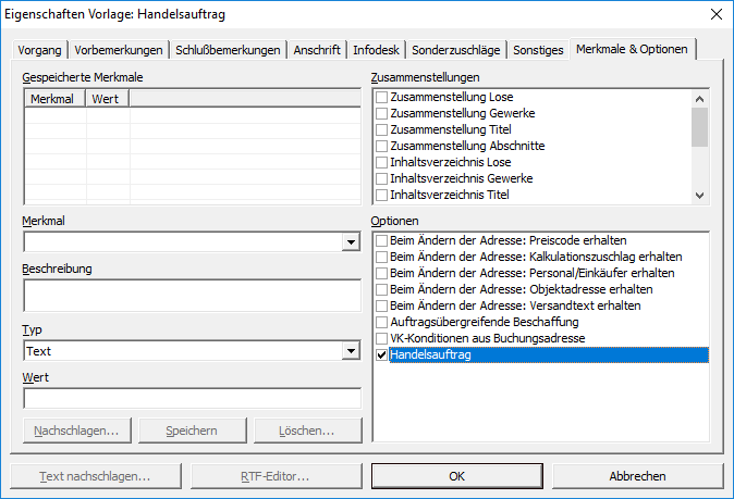 Öffnen Sie die Eigenschaften ... F8, darin die Registerkarte Merkmale & Optionen und stellen Sie die Option Handelsauftrag ein: