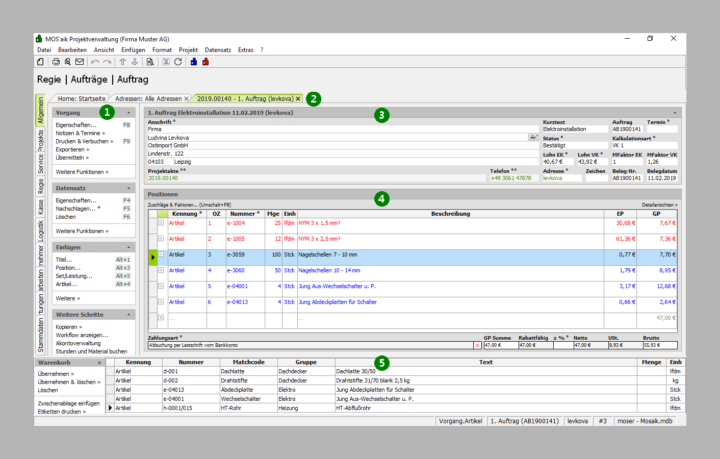 Warenkorbleiste Über die Warenkorbleiste können Datensätze z.B. kopiert, zwischengespeichert und in andere Vorgänge übertragen werden (dazu mehr im Handbuch Projektverwaltung - Warenkorbfunktionen). |