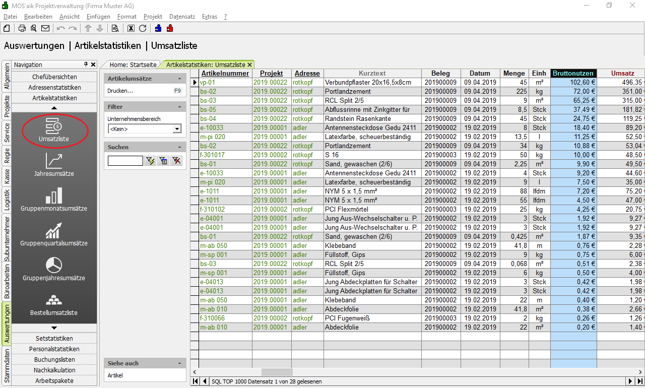 Umsatzliste Mit der Umsatzliste erhalten Sie einen vollständigen Überblick über die verbrauchten Artikel inklusive der Mengen , Umsätze und des Bruttonutzens (Bruttonutzen = DB I Gesamt = VK - Kosten (Soll)). Durch entsprechende Filterung und Sortierung erhalten Sie schnell die gewünschten Informationen. |