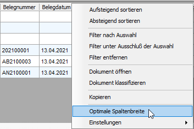 Dokumentenliste Dieser Bereich zeigt in einer Tabelle alle im ecoDMS archivierten Dokumente an, die auf die im "Such-/Klassifizierungsbaum" ausgewählten Filter passen. Durch Auswahl weiterer Filter kann diese Liste bei Bedarf weiter eingeschränkt werden.