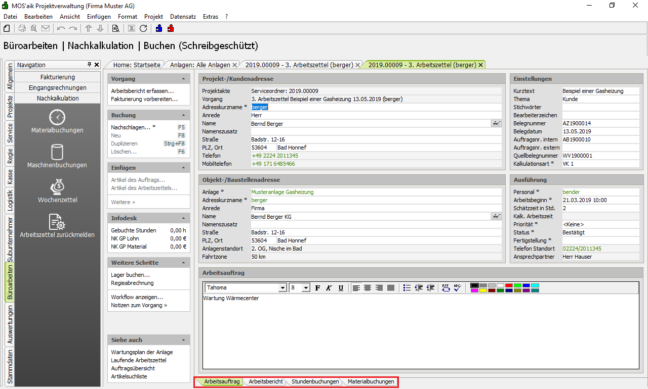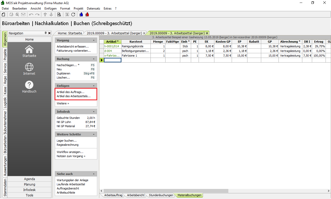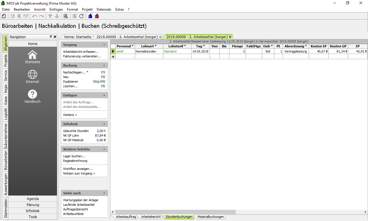 Funktion Nachkalkulation » Stunden und Material buchen: