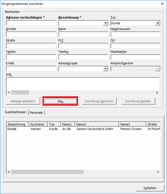 mit einem Klick auf Neu eine weitere Adresse zum Vorgang