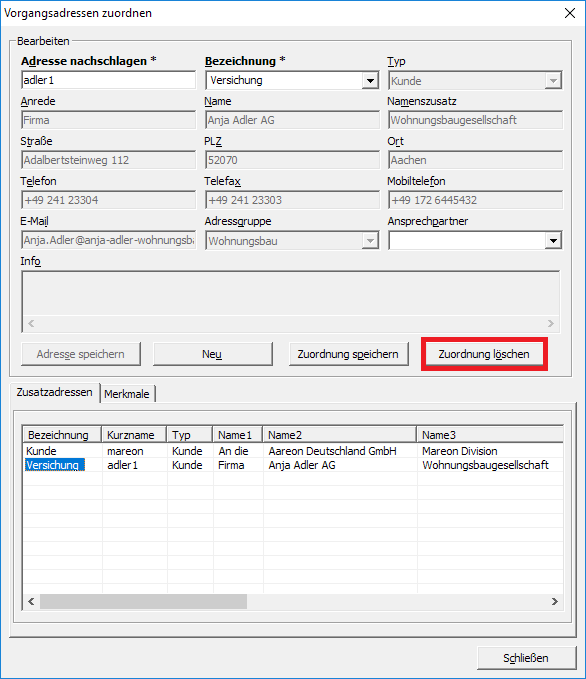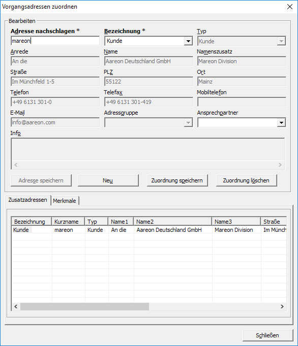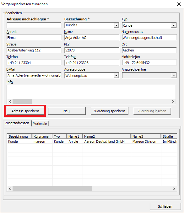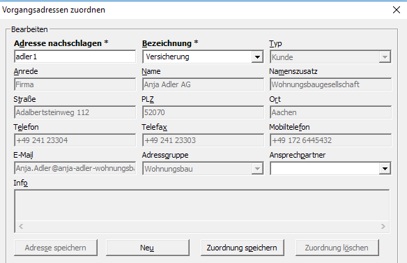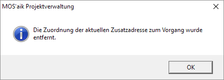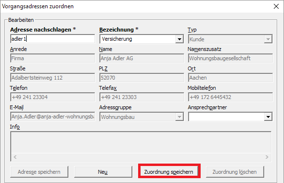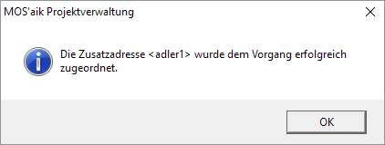 Wurde die Zuordnung der Adresse zum Vorgang gespeichert, erscheint eine