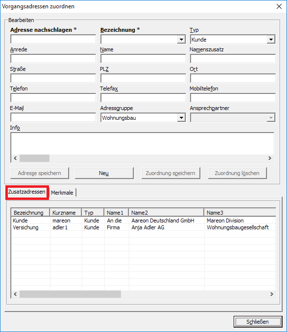 Im unteren Bereich des Dialoges Zusatzadressen werden alle Adressen angezeigt, die dem Vorgang bereits