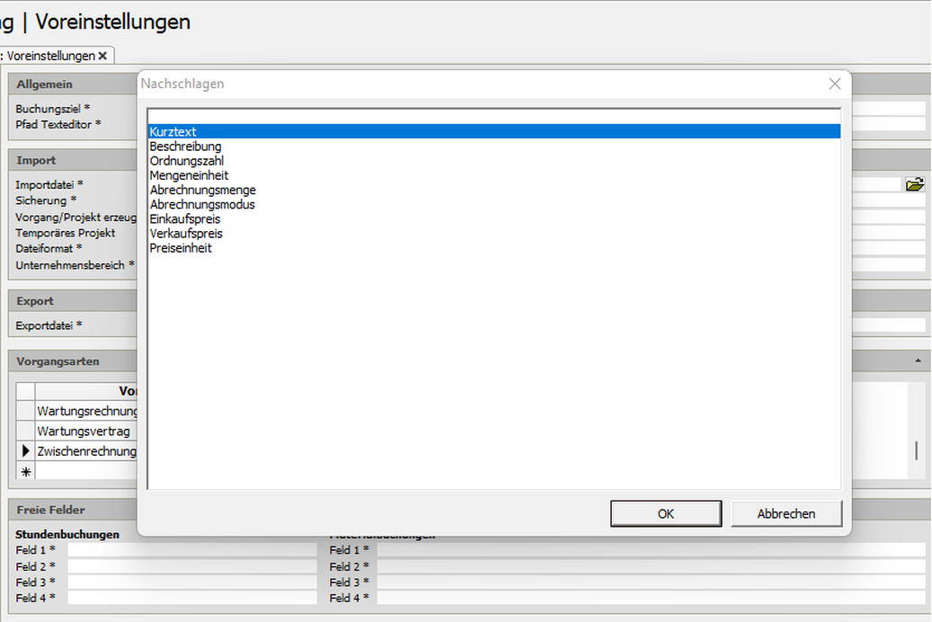Module | Zeiterfassung | Voreinstellungen“ beispielsweise wird der Inhalt aus Feld 1 in den Kurztext übernommen.