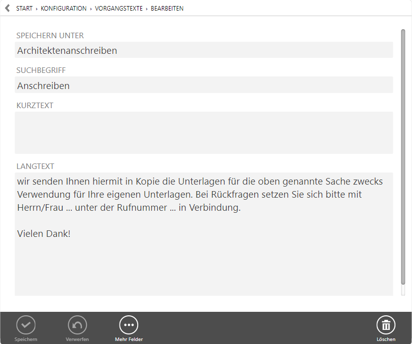 Mit einem Vertragstext können entsprechende Vereinbarungen in einen Vorgang eingefügt werden. Vertragstexte erscheinen nur auf Angebots- und Auftragsbelegen, sofern dies nicht anders eingestellt wird.