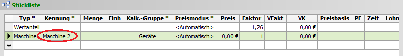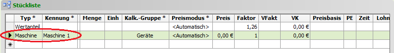 Legen Sie ein neues Set "t-001" an und fügen Sie in die Stückliste dieser Leistung eine Maschine (