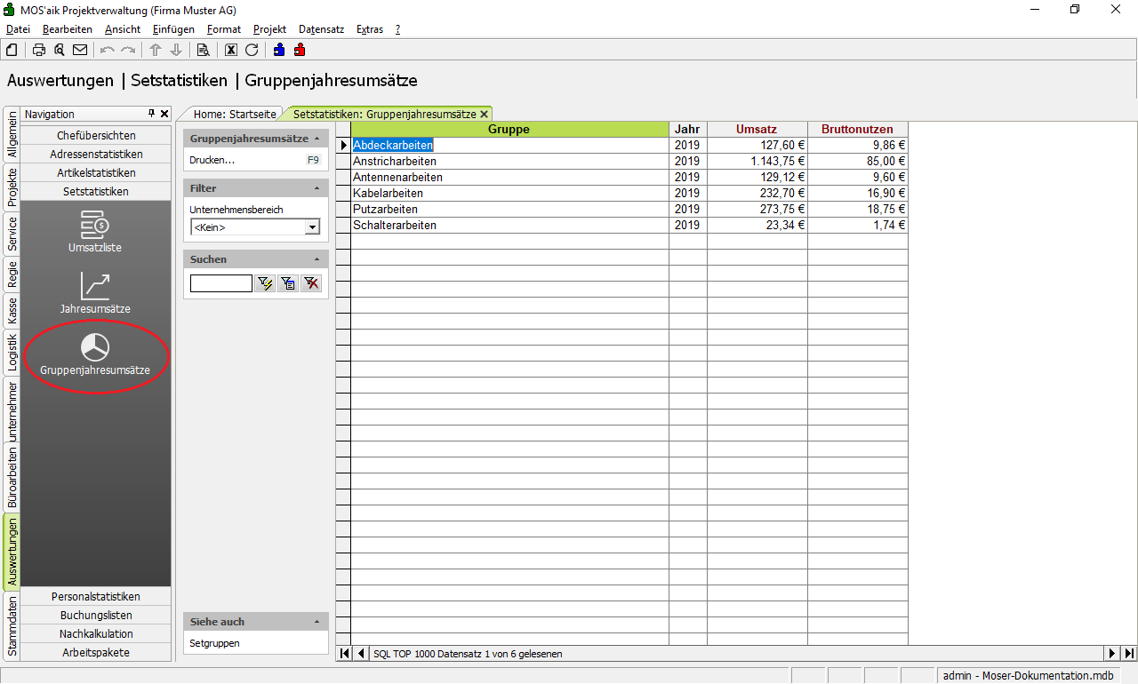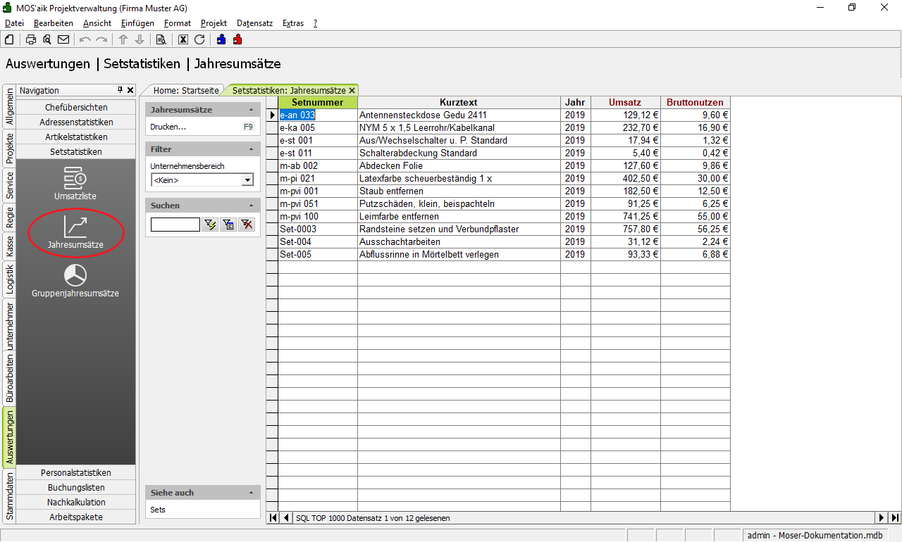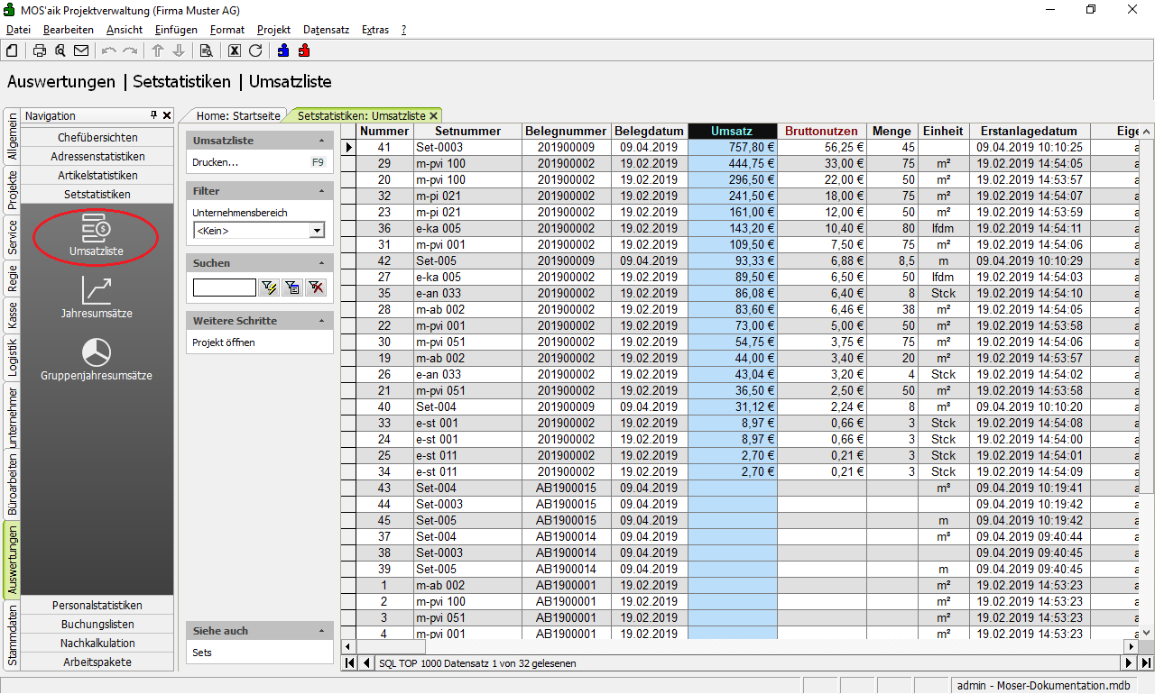 Die fakturierten Umsätze Ihrer Leistungen werden statistisch erfasst. Alle Statistiken finden Sie im Ordner Auswertungen | Setstatistiken: