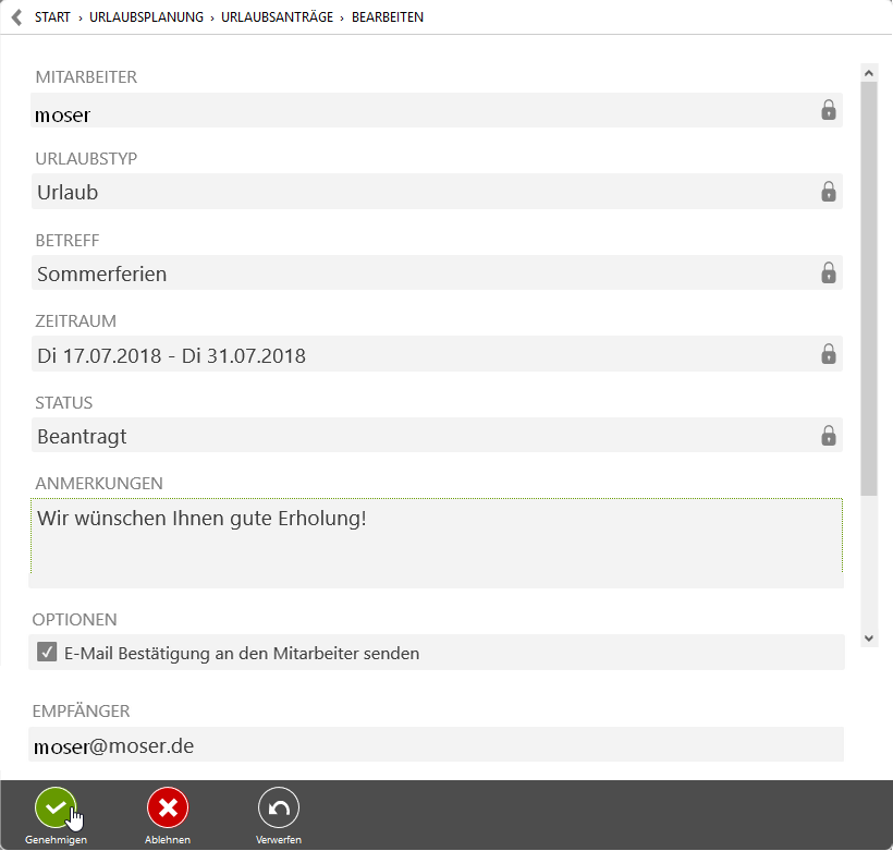 Bei eingerichtetem E-Mail Server (siehe Abschnitt 25.16, „E-Mail-Server“) kann dem Antragsteller eine Bestätigung per E-Mail zugestellt werden. Damit kann ihm mitgeteilt werden, ob der Antrag genehmigt oder abgelehnt wurde.