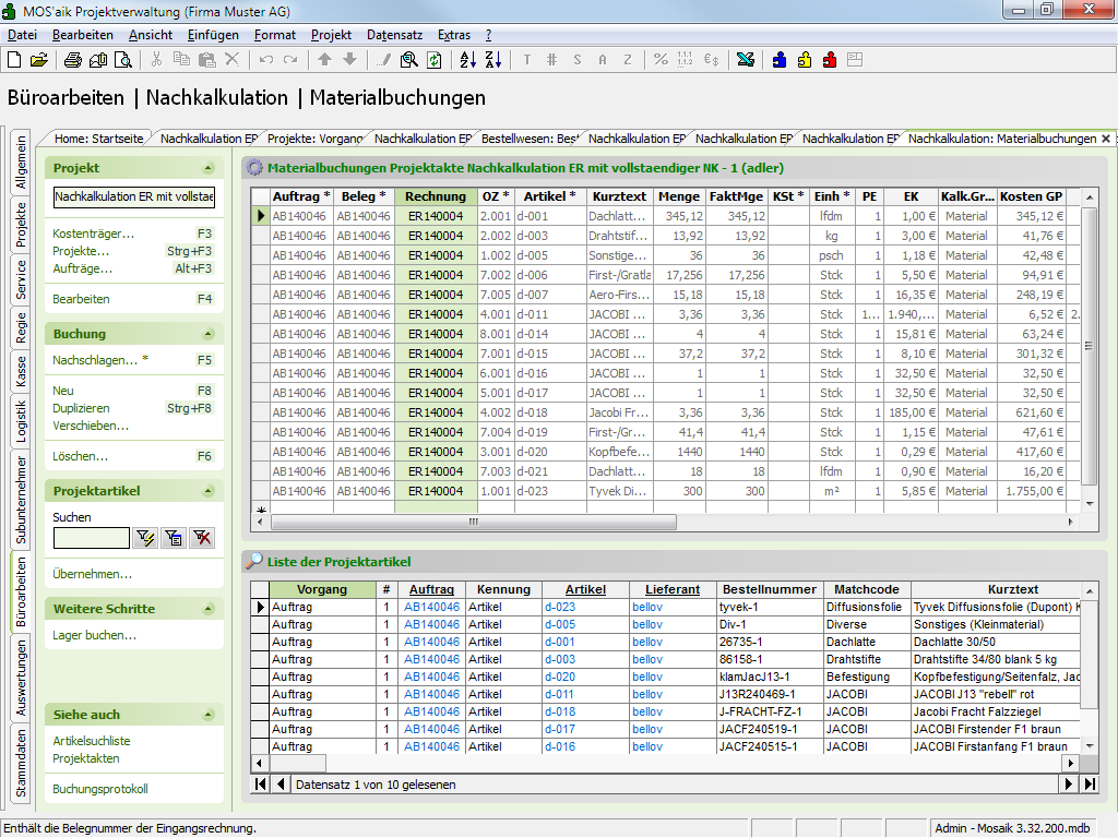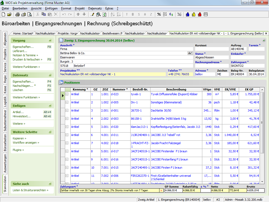 Sie können Nachkalkulationsdaten beim Buchen/Drucken einer Eingangsrechnung in der MOS'aik-Projektverwaltung