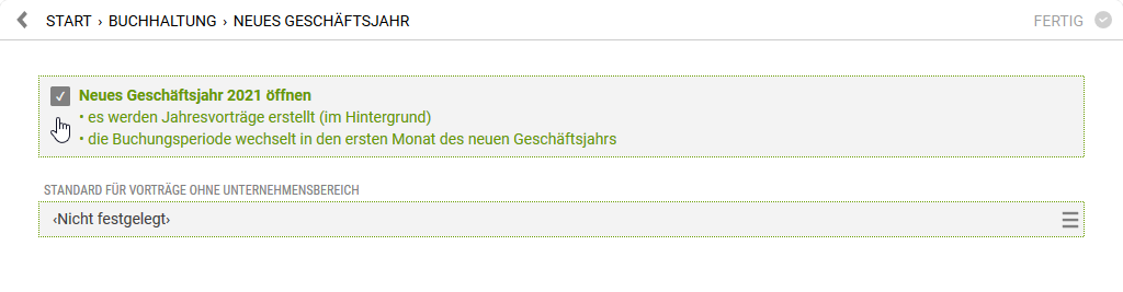 Mit dem Geschäftsjahreswechsel werden automatisch die Vorträge für das neue Jahr erzeugt. Dabei werden die Vortragsbuchungen pro Unternehmensbereich ausgeführt.