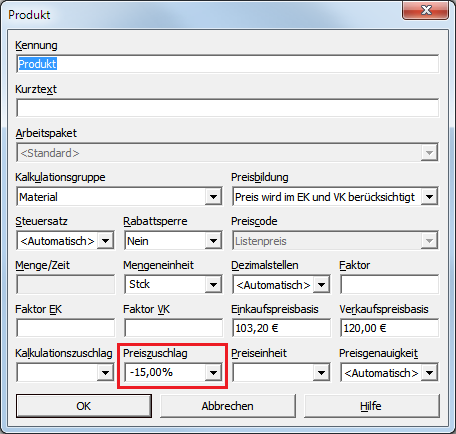 Der Rabatt wird als negativer Preiszuschlag aus den Verkaufskonditionen übernommen und im Produktanteil des Artikels abgelegt. |
