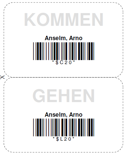 Personalkarte Kommen/Gehen Es wird ein zweiseitiges Etikett im Kreditkartenformat mit dem Namen des Mitarbeiters im Klartext sowie den Strichcodes für KOMMEN und GEHEN gedruckt: |