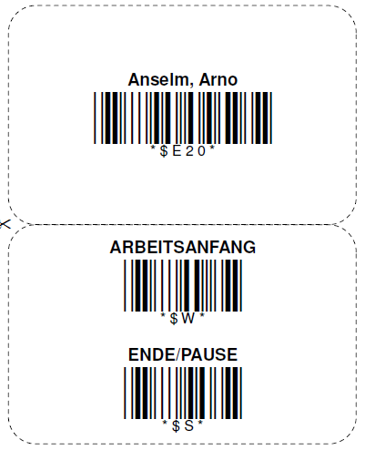 Personal-Barcodekarte Es wird ein zweiseitiges Etikett im Kreditkartenformat mit dem Namen des Mitarbeiters im Klartext, der codierten Personalnummer sowie den Strichcodes für den ARBEITSANFANG, PAUSEnanfang und ArbeitsENDE gedruckt: |