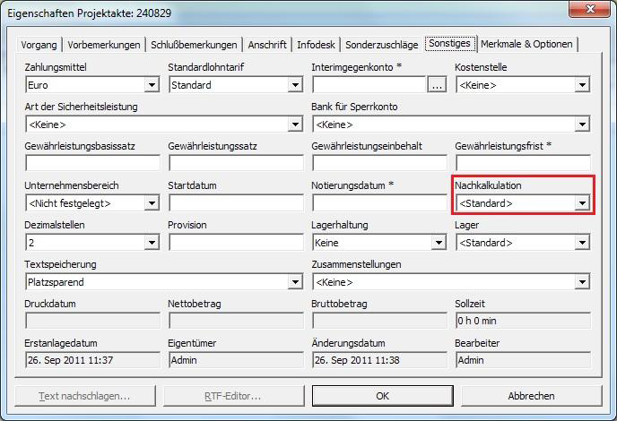 Abbildung 6.1. Einstellung zur Nachkalkulation