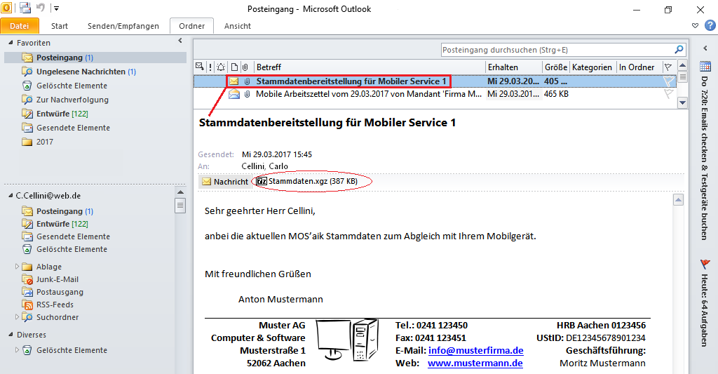 Auf dem Mobilgerät werden die gesendeten Stammdaten mit Microsoft Outlook® empfangen. Die empfangene E-Mail mit den Daten zum Stammdatenabgleich wird im Posteingang aufgelistet: |