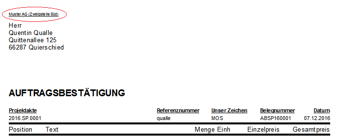Über das Feld Absenderadresse kann eine für den Unternehmensbereich angepasste Adresse eingestellt werden, die beim Vorgangsdruck ausgegeben wird: