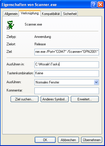 "C:\Scanner.exe" /Port="COM3" /Scanner="OPN2001" Beachten