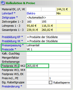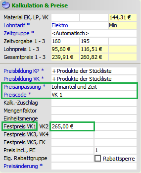 In diesem Fall berechnen sich Lohnpreis und Zeitvorgabe bei einer Änderung des Festpreises oder Materialpreises wie folgt: