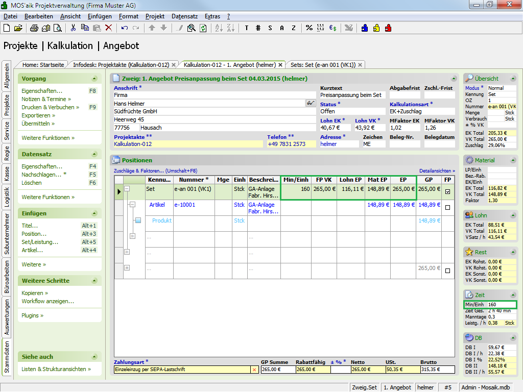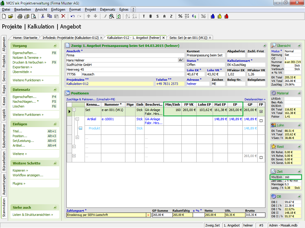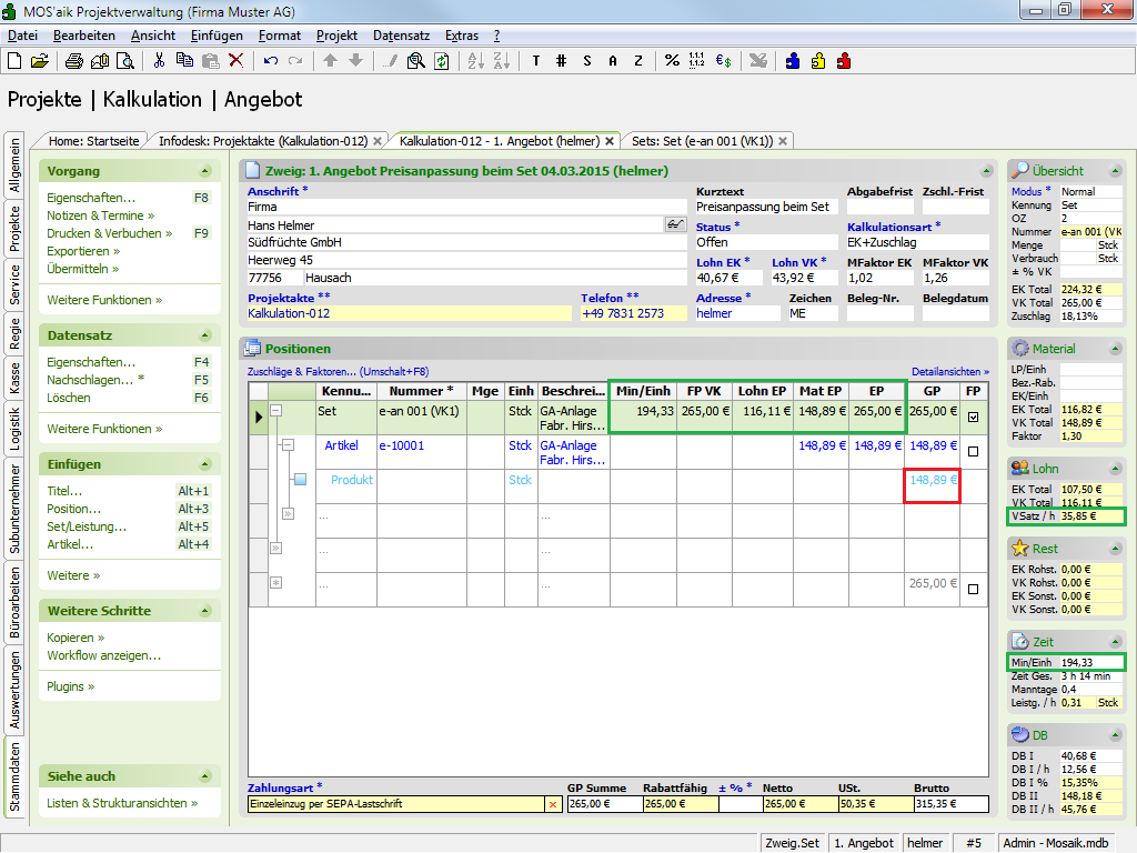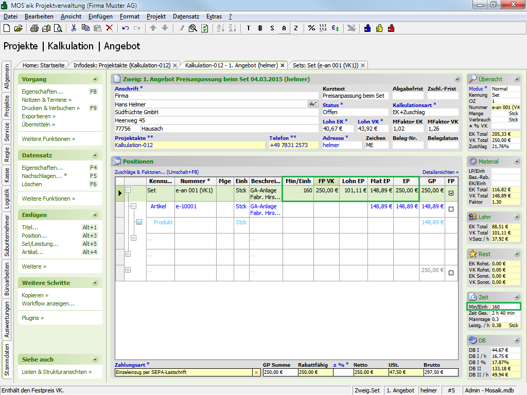 Preisanpassung "<Automatisch>" für Lohn und Material bei Änderung des FestpreisesDas folgende Beispiel-Set wird in einen Vorgang eingefügt:Abbildung 5.30. Beispiel Set 'e-an 001 (VK1)'