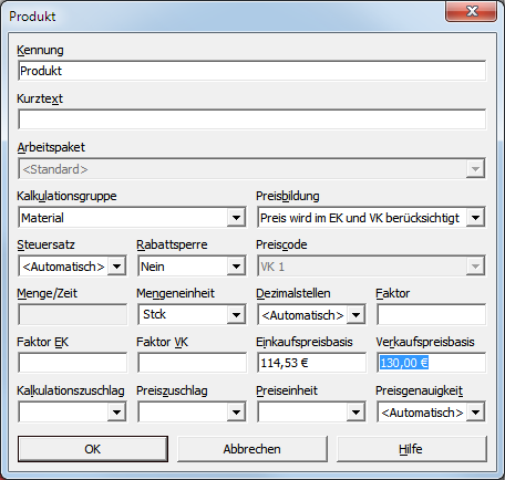 Min/Einhbei einer Änderung des Festpreises oder Materialpreises unverändert. Lohn- und Materialpreise werden entsprechend angepasst. Die Auswirkung einer Preisänderung berechnet sich wie folgt:Der Festpreis legt hier den EP fest, der sich aus Lohn und Material zusammensetzt: FP VK = EP = Lohn EP + Mat EP Änderung des Materialpreises: Eine Änderung des Materialpreises ergibt den Lohnpreis durch Umformung der Gleichung: Lohn EP neu = FP VK - Mat EP neu Festpreisänderung: Vor einer Festpreisänderung stehen Lohn und Material in einem bestimmten Aufteilungsverhältnis: 100% = Lohnanteil + Materialanteil = Lohn EP / FP VK + Mat EP / FP VK Nach einer Festpreisänderung bleibt die Zeitvorgabe und das Verhältnis von Lohn und Material erhalten: Lohn EP neu = Lohnanteil x FP VK neu Mat EP neu = Materialanteil x FP VK neu -