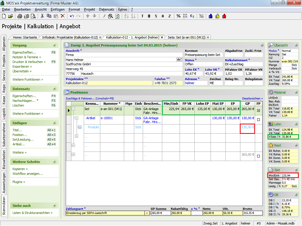 Aufgrund des im Set festgelegten Preiscodes VK1 ist die eingestellte Kalkulationsart bzw. der Preiscode des Vorgangs nicht relevant. Zur Veranschaulichung der Ergebnisse werden die SpaltenMin/Einh,FP VK,Lohn EP,Mat EPundFPsowie die Detailansichten » Kalkulationsdetails eingeblendet:Abbildung 5.31. Vorgangsansicht vor Festpreisänderung