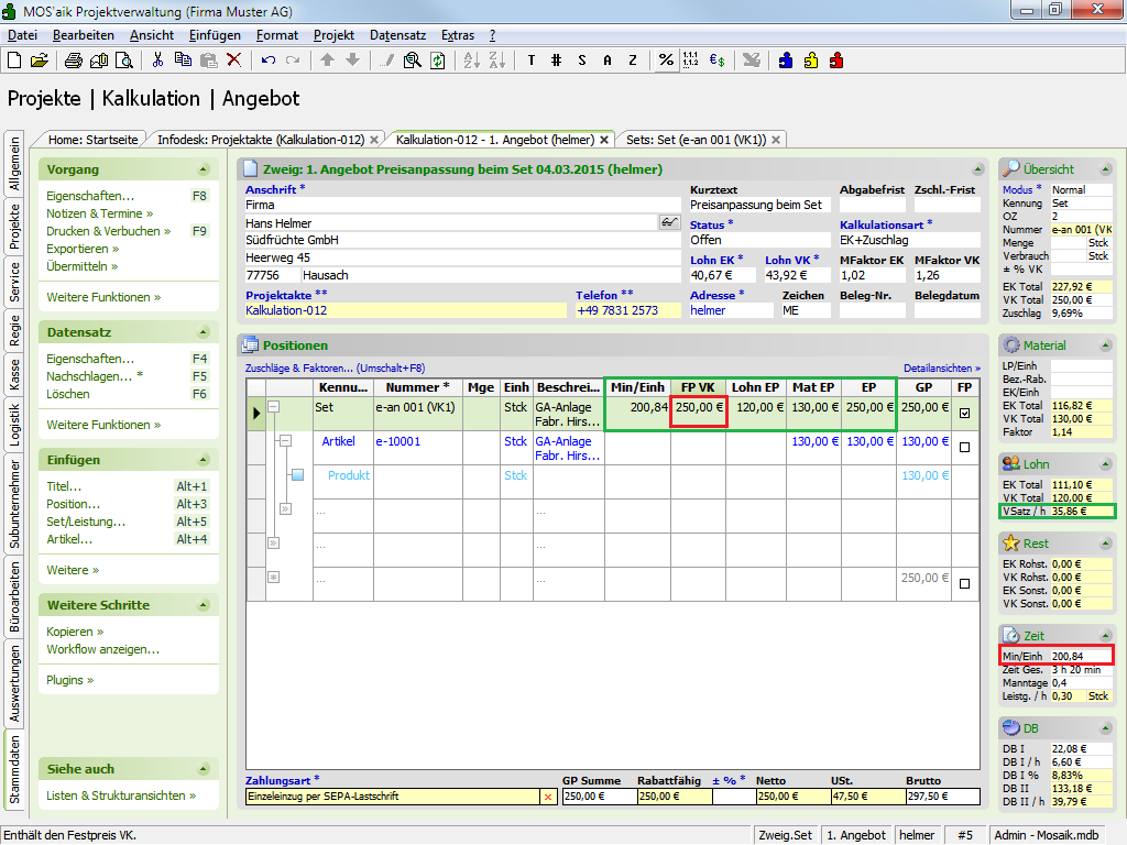 Die Preisänderungen ergeben sich wie folgt:Beispiel (Abbildung): Lohn EP = FP VK - Mat EP = 250,00€ - 130,00€ = 120,00€ Min/Einh = Lohn EP x 60min / Verrechnungssatz = 120,00€ x 60min / 35,85€ ≈ 200,84min