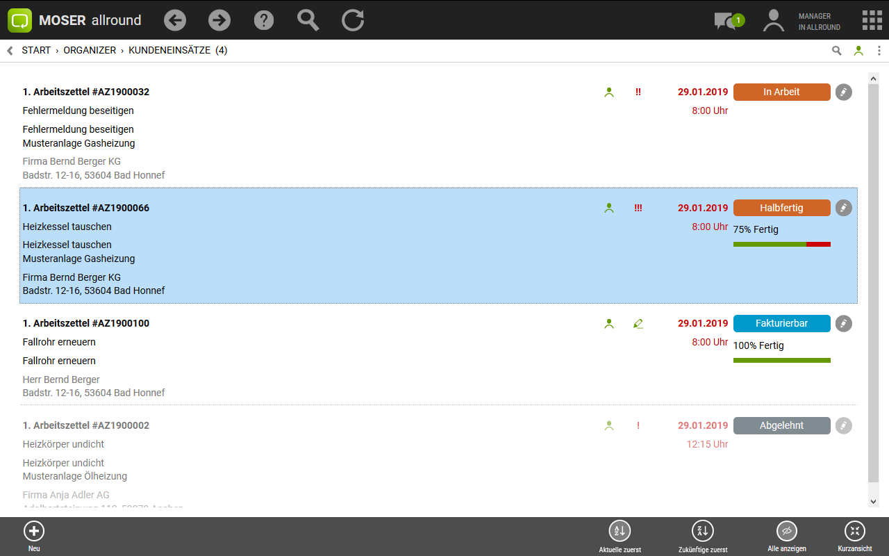Für die Verwendung der Kundeneinsätze in 'allround' arbeiten Sie entweder im lokalen Netzwerk (Firmennetz) oder stellen einen Zugriff auf die Anwendung über das Internet zur Verfügung. Wählen Sie einen Kundeneinsatz über das Stiftsymbol zur Bearbeitung aus, um auf die Funktionen der Workflow-Ansicht zugreifen zu können. |