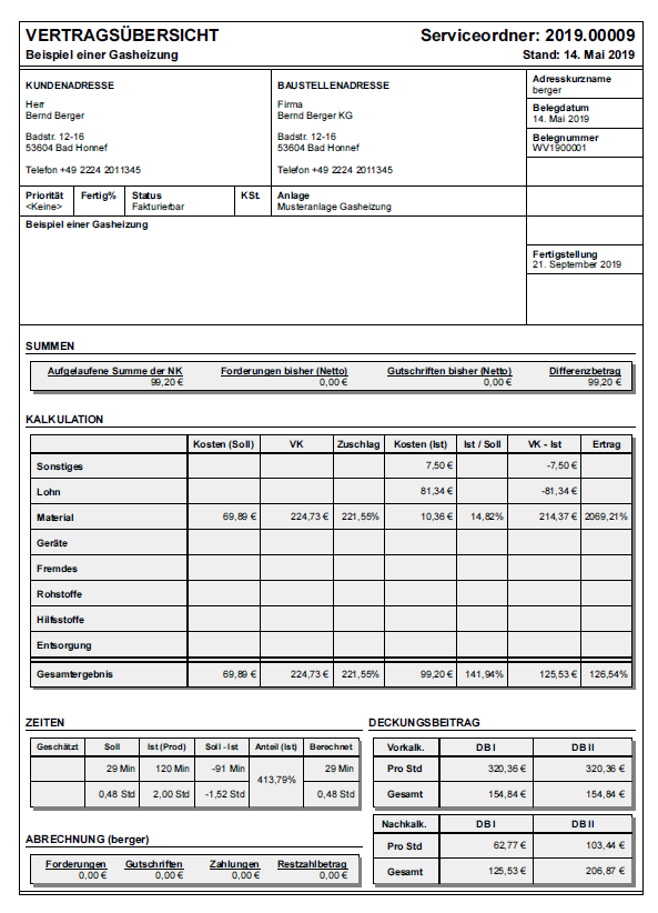 Öffnen Sie den Wartungsvertrag oder eine zugehörige Wartungsrechnung und wählen das Menü → → → . Die Vertragsübersicht zeigt pro