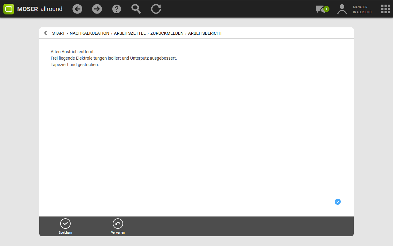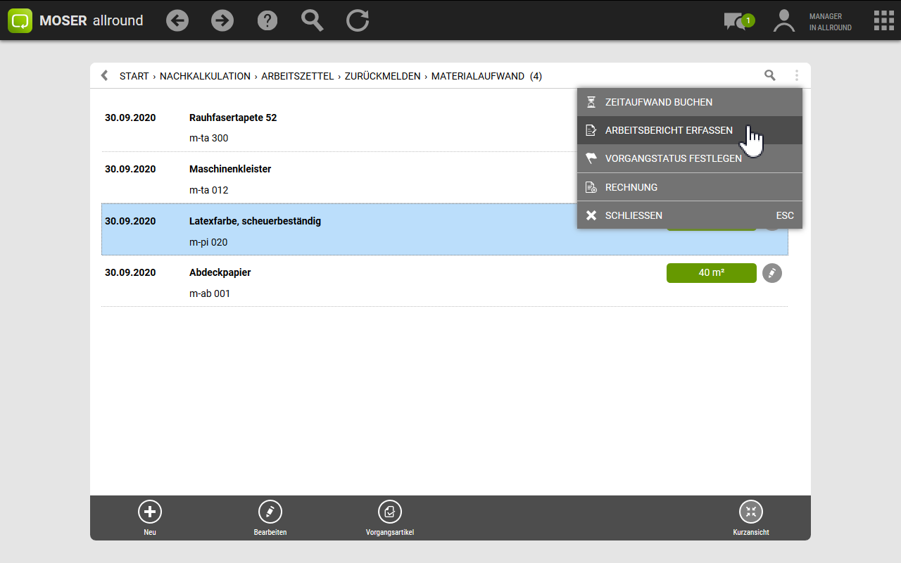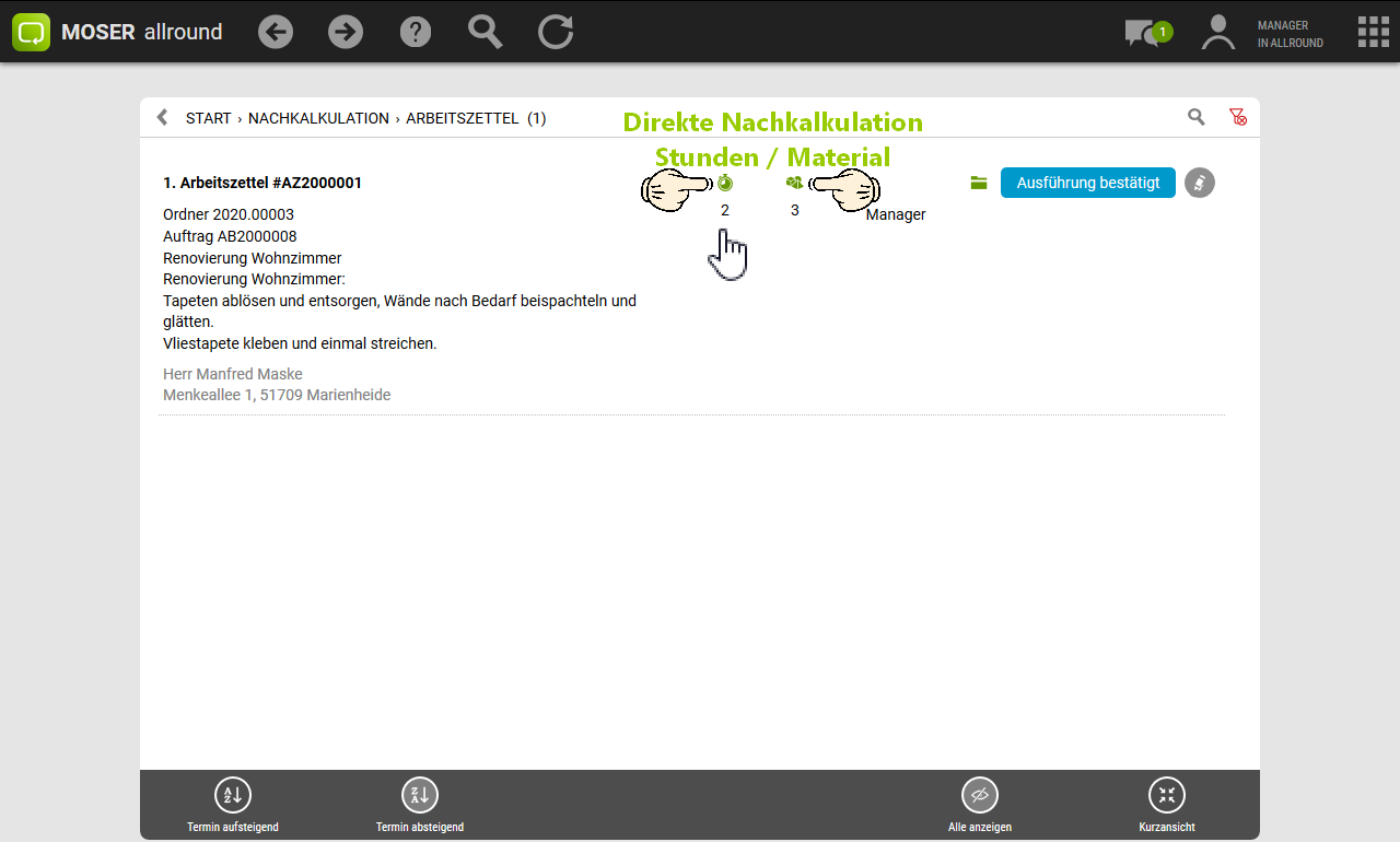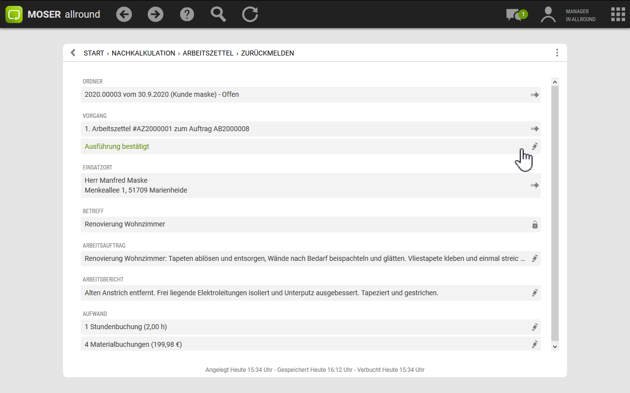 Im Bereich finden Sie Ihre gedruckten Arbeitszettel, können bearbeitete Arbeitszettel zurückmelden und geleistete Arbeitsstunden und den Materialverbrauch nachkalkulieren.