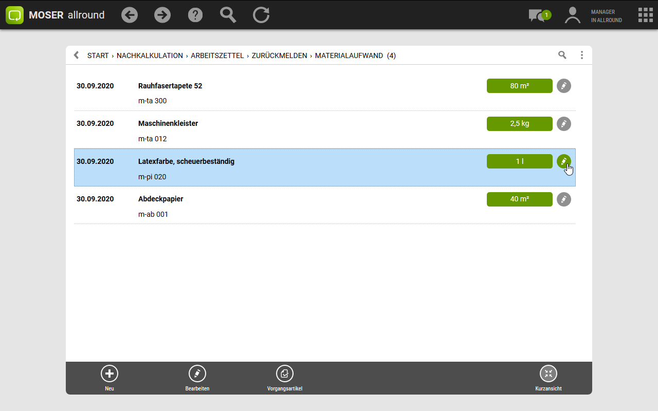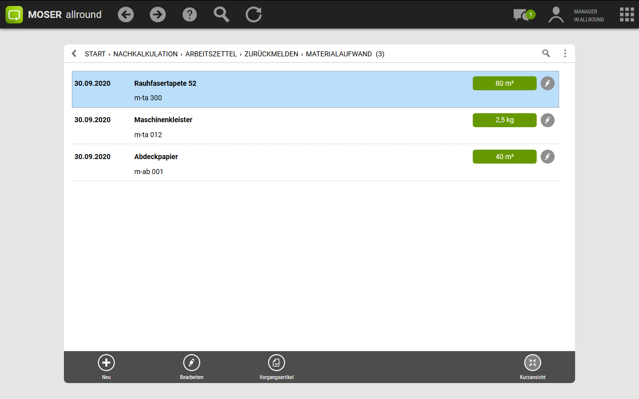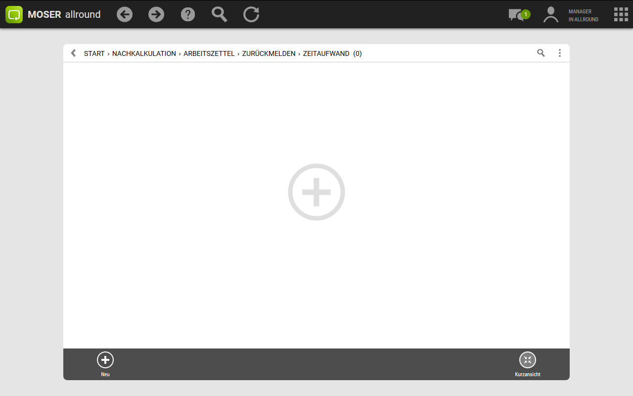Im Bereich finden Sie Ihre gedruckten Arbeitszettel, können bearbeitete Arbeitszettel zurückmelden und geleistete Arbeitsstunden und den Materialverbrauch nachkalkulieren.
