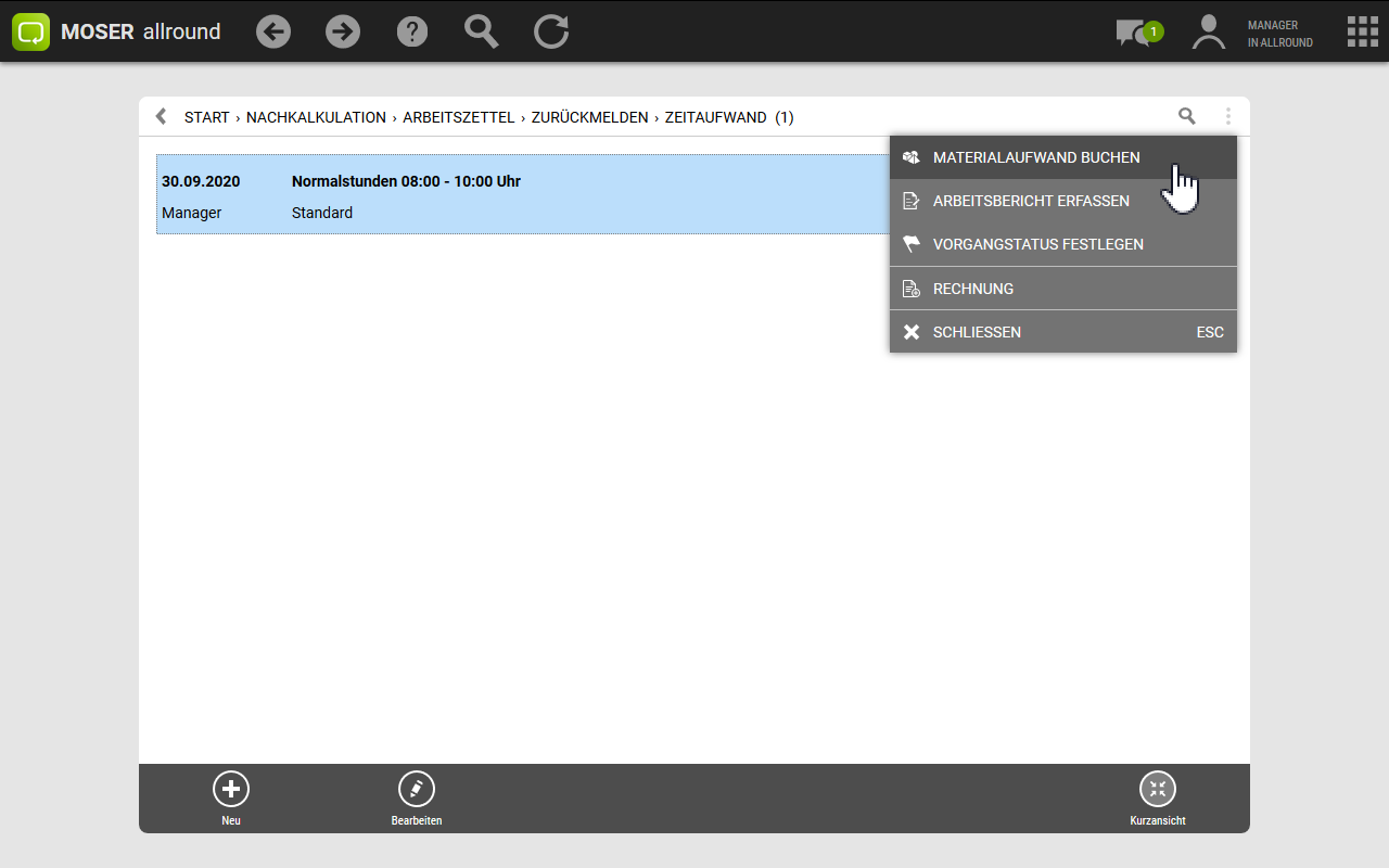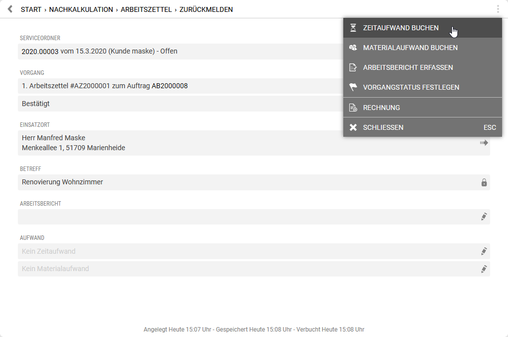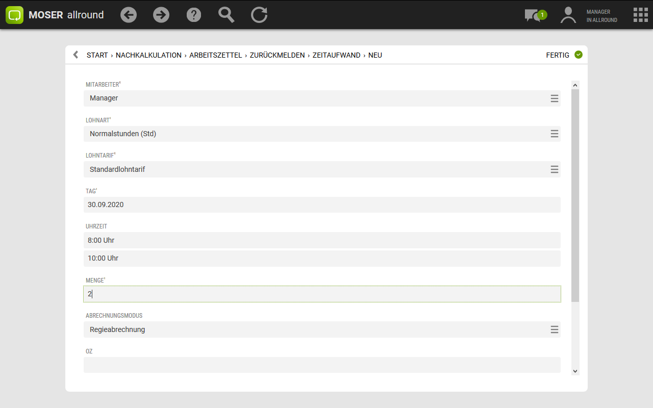 Im Rahmen der Nachkalkulation kann der beim Buchen von Stunden auch die OZ der Gliederung aus dem Auftrag angegeben werden.