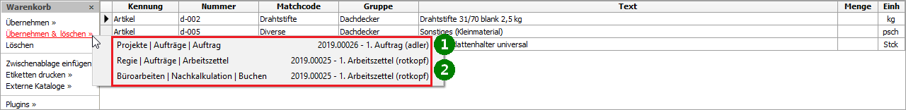 Eine Warenkorbübernahme zu diesem (gedruckten) Arbeitszettel ist jedoch noch im Rahmen der Nachkalkulation möglich. Im Beispiel wurde dieser dazu im Arbeitsblatt Büroarbeiten | Nachkalkulation | Buchen geöffnet, das nun ebenfalls für eine Warenkorbübernahme angeboten wird.