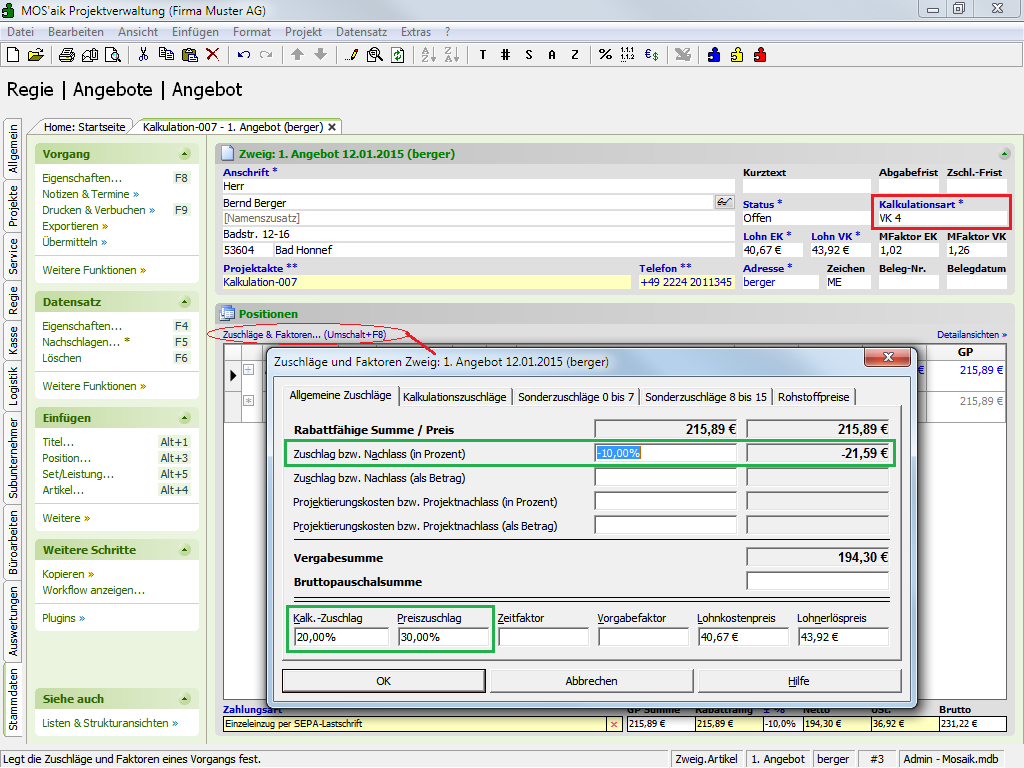Zuschläge & Faktoren ... (Umschalt+F8) zeigt die aus den Kundenstammdaten in den