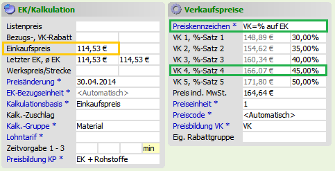 Beispiel (Abbildung): VK 4 = Einkaufspreis + %-Satz 4 = 114,53€ + 45% ≈ 166,07€(siehe auch Preiskennzeichen, VK 1 ... 5 Festpreiskalkulation)