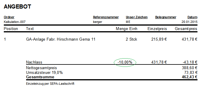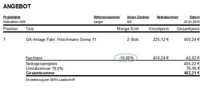 GPdes Vorgangs:Beispiel (Abbildung): Nettogesamtpreis = GP + Grundrabatt = GP - 10% = 450,24€ x 0,9 ≈ 405,22€ (Vergabesumme)Der gewährte Grundrabatt wird beim Vorgangsdruck offen ausgezeichnet: