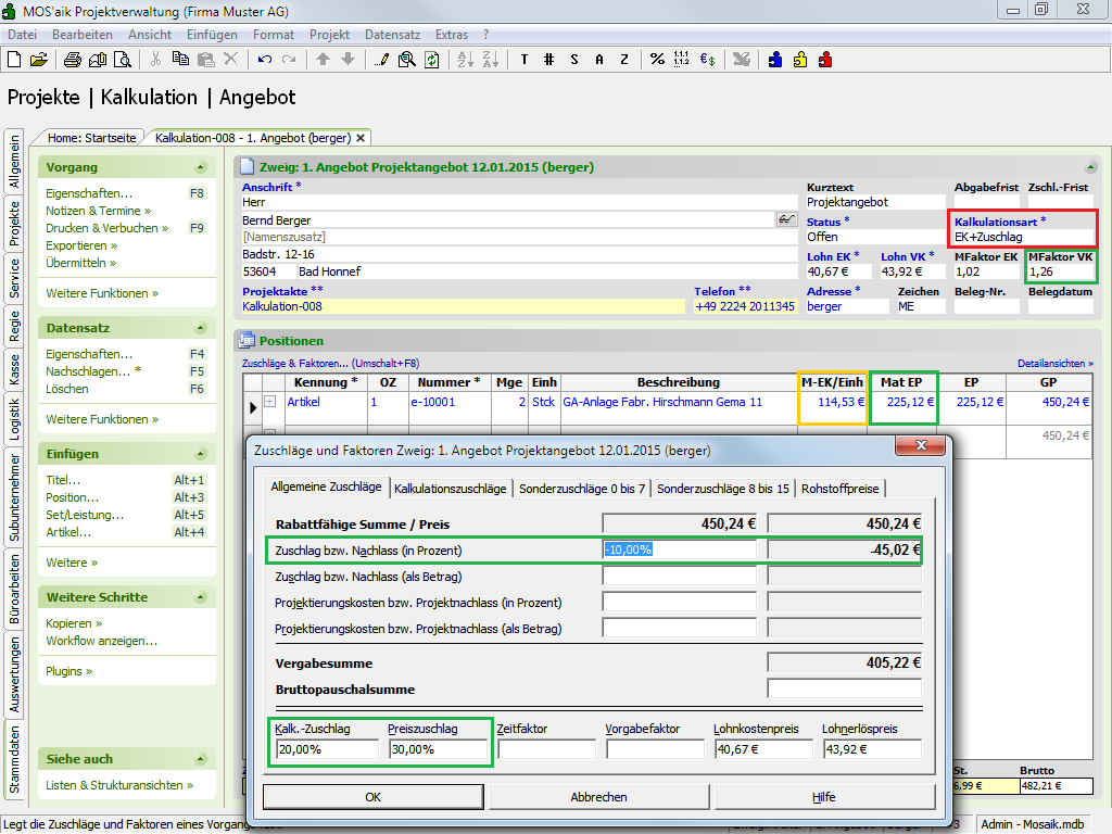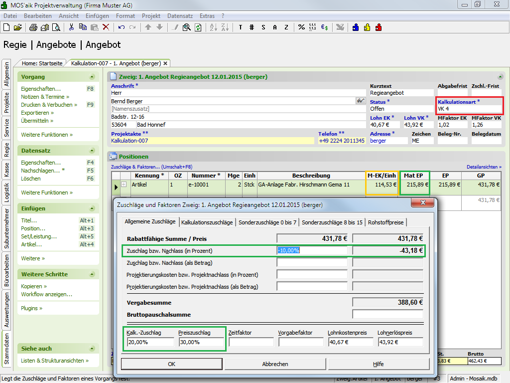 Projektangebot 'berger' ZuschlagskalkulationEs wird ein Projektangebot für den Kunden berger erstellt und ein Artikel e-10001 eingefügt. Die Kalkulationsart im Vorgangskopf wird aus der entsprechenden Einstellung in den Kundenstammdaten vorgegeben (hier EK+Zuschlag). Der Einkaufspreis des Artikels wird als Material-EK (Spalte