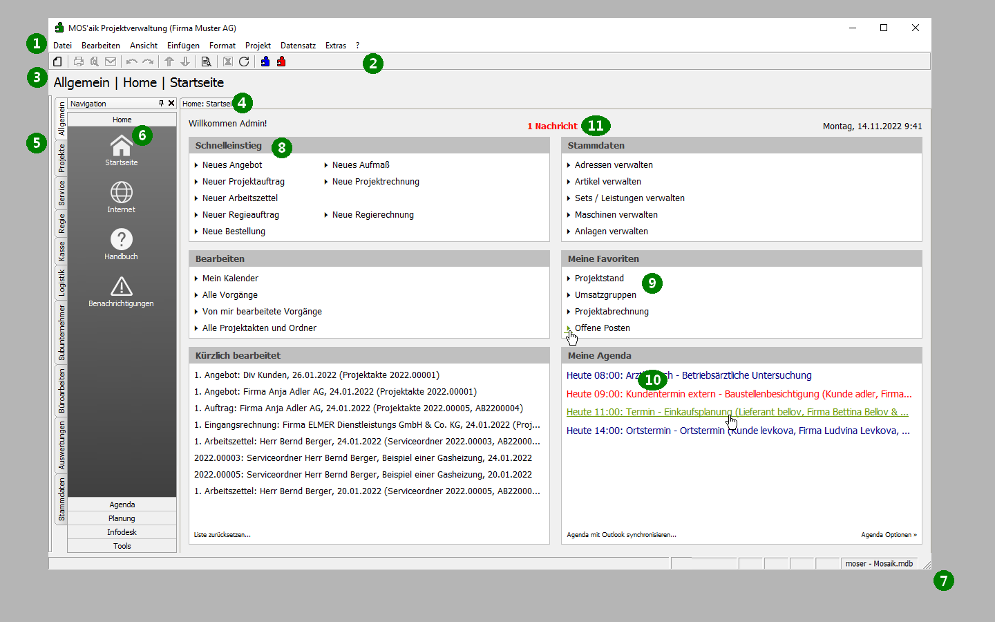 Auf der Startseite finden Sie die Schnellaufrufe für häufig verwendete Aufgaben. Der Inhalt der Seite ist dabei von den lizenzierten Modulen abhängig.