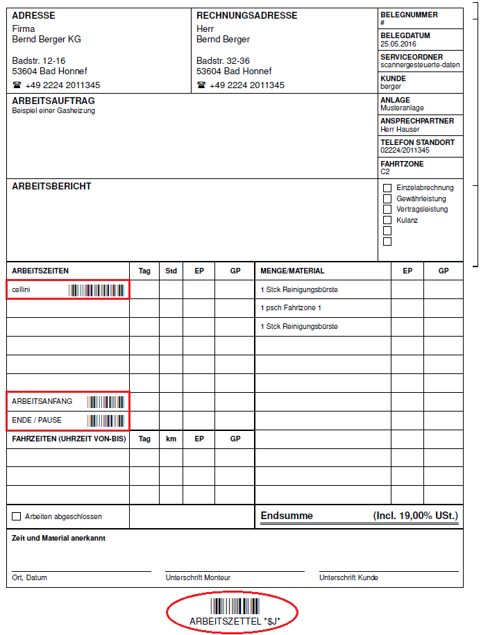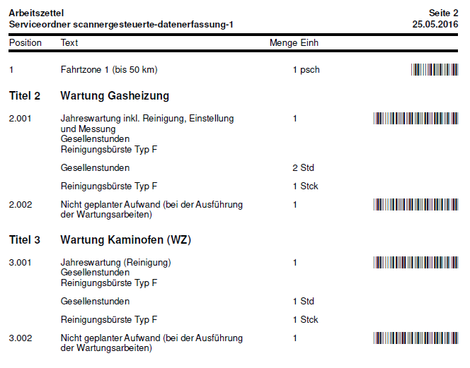 Wenn das MOS'aik Modul Scannergesteuerte Datenerfassung lizenziert wurde, erfolgt für Serviceaufträge und Arbeitszettel (Arbeitsauftrag) der Druck von Belegnummern sowie der Ordnungszahlen von Positionen, Sets und Artikel im Klartext und als Barcode. Bei verschachtelten Artikeln, Sets und Positionen wird grundsätzlich nur die Ordnungszahl der höchsten Gliederung gedruckt.