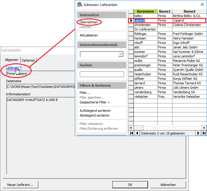 [67] Bitte beachten Sie, dass mit dieser Funktion der neue Lieferant lediglich mit einem Kurznamen gespeichert wird. Sie sollten unbedingt zeitnah weitere Informationen zur neuen Lieferantenadresse zufügen, wie z.B. Anschrift, Kontaktinformationen, Verrechnungssätze etc. (siehe dazu Handbuch Projektverwaltung - Adressen bearbeiten).