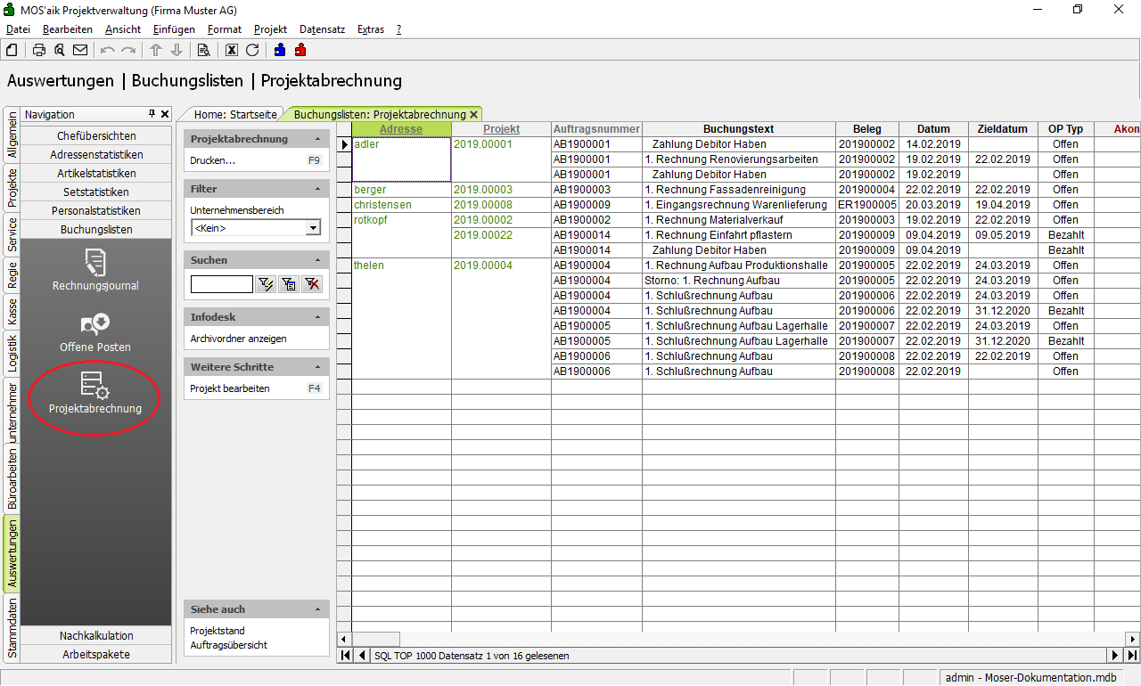 Projektabrechnung Zeigt eine Liste der Buchungen pro Projekt an. |