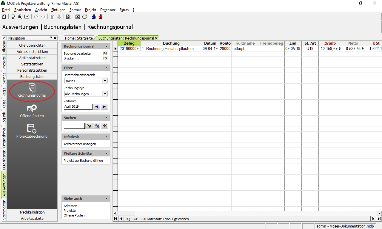 Rechnungsjournal Zeigt das Rechnungsjournal pro Projekt an. |