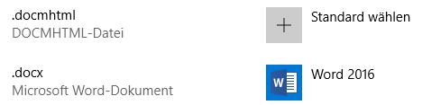 Klicken Sie auf die zugeordnete App (hier z.B. Word 2016) oder auf Standard wählen, um die Zuordnung auf ihr gewünschtes Programm zu ändern.